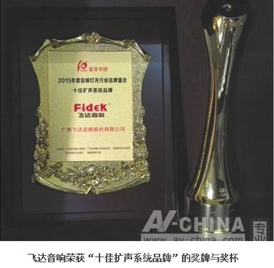 在備受矚目的2015年音響燈光行業(yè)十佳品牌頒獎盛典上,飛達(dá)音響(Fidek)獲得“十佳擴(kuò)聲系統(tǒng)類品牌獎”,董事長何歡潮博士與其他企業(yè)代表在全場近900位行業(yè)人士的共同見證下上臺接受表彰。
