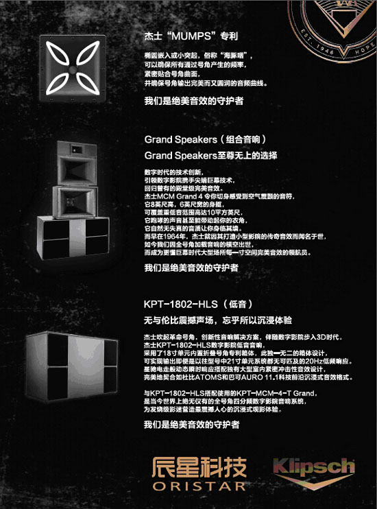 Klipsch在技術(shù)上精益求精,它的產(chǎn)品遍及全球80多個(gè)國(guó)家,無論在家庭音響系統(tǒng)、電子領(lǐng)域、還是在專業(yè)的影院、商務(wù)設(shè)備應(yīng)用方面都可以看到Klipsch的產(chǎn)品。2015年,美國(guó)杰士音響與辰星公司達(dá)成戰(zhàn)略合作,正式進(jìn)入中國(guó)影院市場(chǎng)。選擇辰星科技作為其最大合作伙伴,雙方將共同合力,勢(shì)必堅(jiān)定地把國(guó)外極具價(jià)值的品牌和產(chǎn)品引進(jìn)中國(guó),惠及中國(guó)廣大影迷。