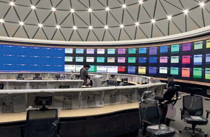 該項(xiàng)目大屏幕系統(tǒng)采用三菱電機(jī)的50英寸高清DLP拼接單元,3行22列數(shù)字拼接組成,用戶的半球形空間結(jié)構(gòu)對(duì)大屏的安裝也提出了挑戰(zhàn),三菱電機(jī)以高技術(shù)品質(zhì)、高清圖像應(yīng)用、高可靠性的產(chǎn)品為江蘇移動(dòng)公司網(wǎng)絡(luò)監(jiān)控系統(tǒng)的搭建和運(yùn)行奠定了堅(jiān)實(shí)的基礎(chǔ)。2015年該系統(tǒng)已正式啟動(dòng)運(yùn)行。
