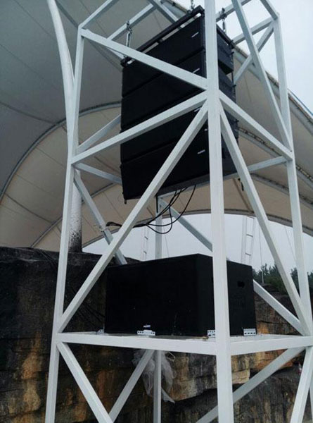 該項目主要采用了英國博思特音響公司的線陣音響產(chǎn)品LA213B以及超低音SK218B、TD類開關電源功放和周邊設備,LA213B線性陣列采用了一個3"歐洲進口高音驅(qū)動器配合指數(shù)型號角設計,使高頻失真降至最低,和兩只13.5"特殊規(guī)格的中低音揚聲器。系統(tǒng)中低音單元采用對稱式相位板技術(專利),有效地解決了雙13.5"中低音單元相互間干涉的問題,提升了其耦合上限,使系統(tǒng)可靠性大大提高。系統(tǒng)為多種優(yōu)化設計的結合體,模具設計的吊掛裝置在很大程度上使產(chǎn)品的安裝更加簡單與方便,結合處更加合理,著力點更加科學,可同時滿足10只LA213B的吊裝而不會出現(xiàn)安全問題。