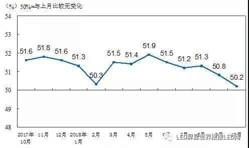 而另一方面,貿(mào)易戰(zhàn)對(duì)中國(guó)制造業(yè)影響正逐步體現(xiàn),特別是對(duì)一些以海外貿(mào)易為主的企業(yè)影響極大。據(jù)國(guó)家統(tǒng)計(jì)局公布的PMI數(shù)據(jù)顯示,2018年10月份,中國(guó)制造業(yè)采購(gòu)經(jīng)理指數(shù)(PMI)為50.2%,比9月回落0.6個(gè)百分點(diǎn),制造業(yè)總體繼續(xù)運(yùn)行在擴(kuò)張區(qū)間,但擴(kuò)張速度放緩。下圖:制造業(yè)PMI指數(shù)(經(jīng)季節(jié)調(diào)整)