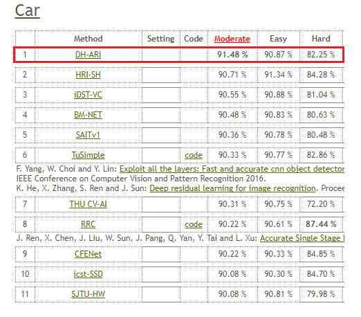 近日,大華股份基于深度學(xué)習(xí)技術(shù)研發(fā)的目標(biāo)檢測技術(shù),刷新了The KITTI Vision Benchmark Suite中2D車輛類目標(biāo)檢測任務(wù)(2d object Detection Evaluation)的全球最好成績,取得了2D車輛類目標(biāo)檢測排行榜第一名,超越一流的AI公司和頂尖的學(xué)術(shù)研究機(jī)構(gòu),以及CVPR 2017與2018年度最佳目標(biāo)檢測研究成果,這標(biāo)志著大華股份在目標(biāo)檢測領(lǐng)域處于世界領(lǐng)先水平。