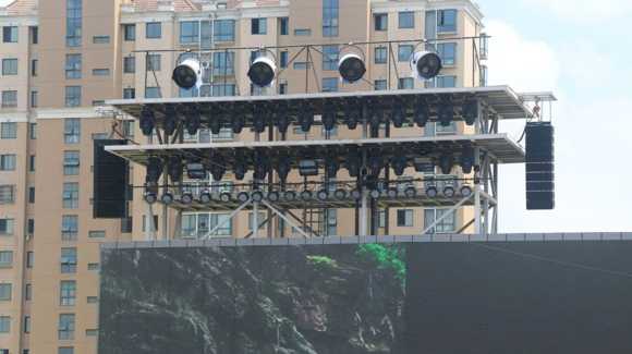 演出空間設(shè)置了爆破、山洪、高空4D威亞等特效設(shè)備,舞臺(tái)擴(kuò)聲系統(tǒng)需要滿足人物對(duì)話、電影配樂、效果聲的綜合功能需求,以增強(qiáng)演出的感染力。同時(shí),要注意精準(zhǔn)控制直達(dá)聲,保證聲場(chǎng)均勻覆蓋觀眾席的每個(gè)角度,并最大限度的降低演出聲對(duì)外界環(huán)境的影響。