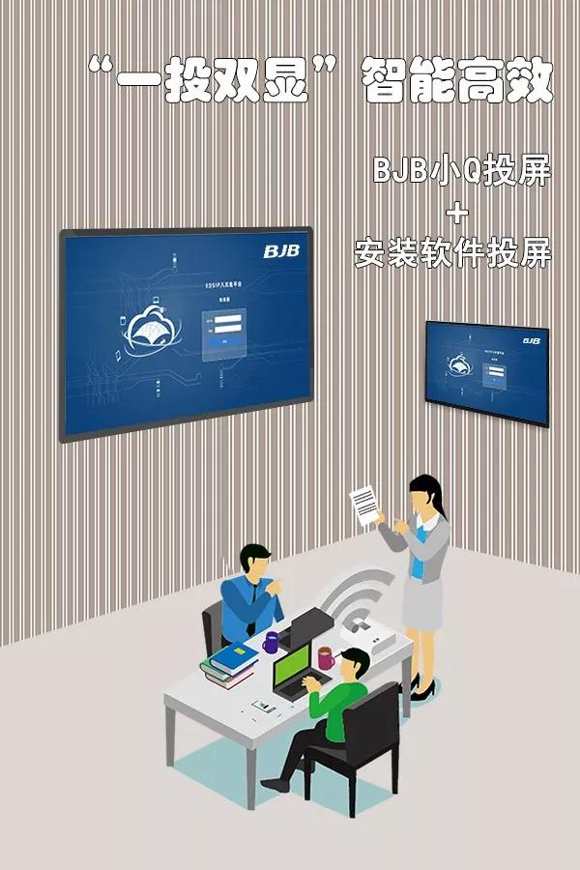 對(duì)于Windows版本設(shè)備使用Q-Share,可實(shí)現(xiàn)“一投雙顯”,即筆記本通過插入小Q可以將內(nèi)容投屏到一塊屏幕,再通過安裝投屏軟件利用本身無(wú)線網(wǎng)卡將屏幕內(nèi)容投屏到另一塊屏幕。如果您的會(huì)議室面積較大且與會(huì)人數(shù)眾多時(shí),這個(gè)功能可以助您一臂之力。