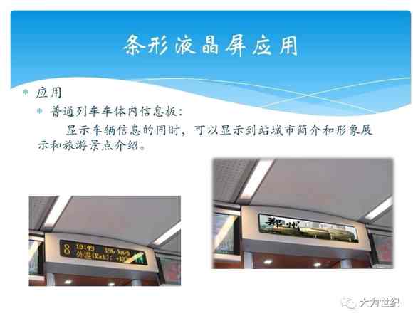 可以作為公交地鐵室內(nèi)報站屏、的士車頂屏,在地鐵、公交汽車顯示,出租車頂部,地鐵車廂,綜合顯示車輛到站信息和其它多媒體信息。
