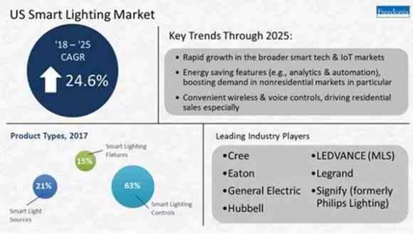 根據(jù)Freedonia Group的一份新報(bào)告,預(yù)計(jì)到2018年底,美國對智能照明的需求(包括光源,燈具和控制裝置)將增加到9.45億美元。市場研究公司表示預(yù)計(jì)到2025年,美國智能照明系統(tǒng)銷售額達(dá)到44億美元。