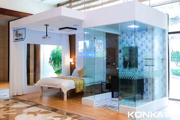 以康佳為例,其智慧酒店秉持“智能體驗(yàn)+暖心服務(wù)”初衷,將操作成本降到最低。在易舒心-商旅場(chǎng)景體驗(yàn)區(qū),筆者親身感受到一次舒服的入住體驗(yàn)。當(dāng)筆者打開(kāi)房門(mén),房間自動(dòng)打開(kāi)“ON 模式”,電視、燈光、空調(diào)、窗簾、空氣凈化器等都開(kāi)始自動(dòng)工作。