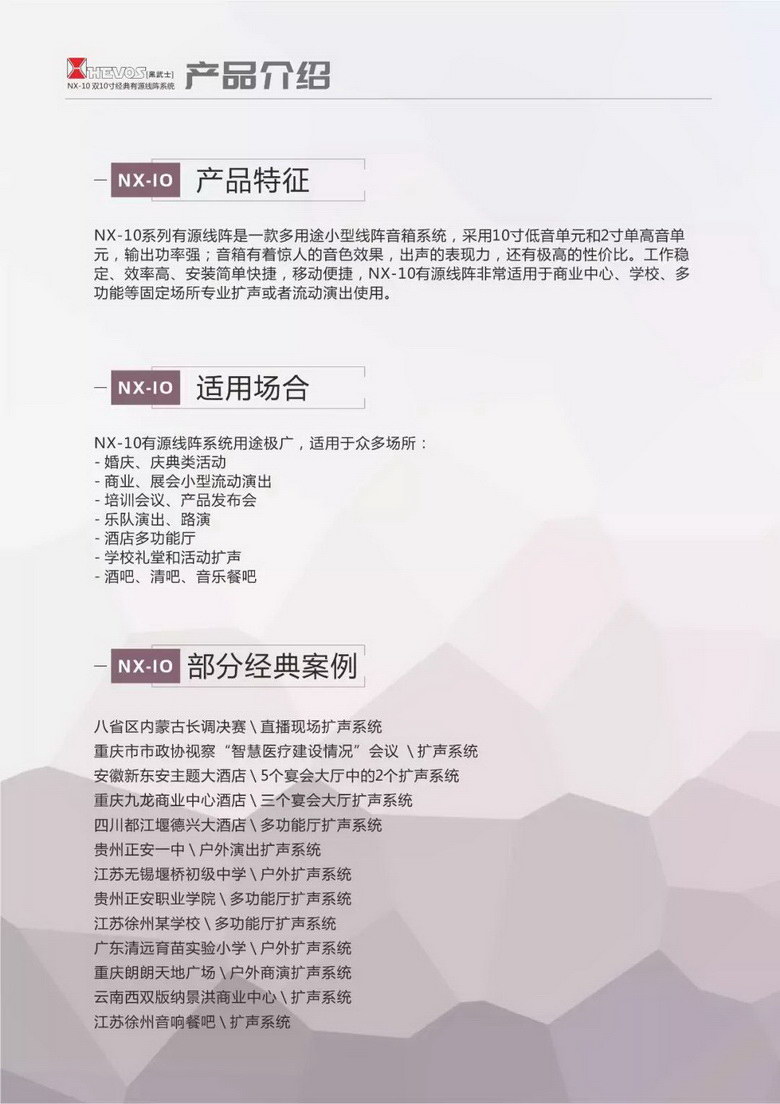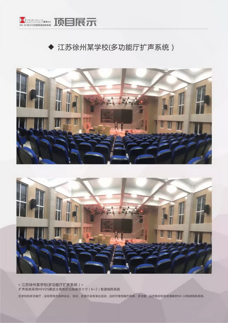 在酒店、學(xué)校、企業(yè)等場所的多功能廳,會經(jīng)常舉辦各種會議、培訓(xùn)、婚慶、或相關(guān)文藝匯演等活動,這時可使用操作簡單、品質(zhì)穩(wěn)定、音質(zhì)清晰的NX-10有源線陣系統(tǒng)。