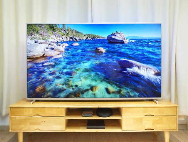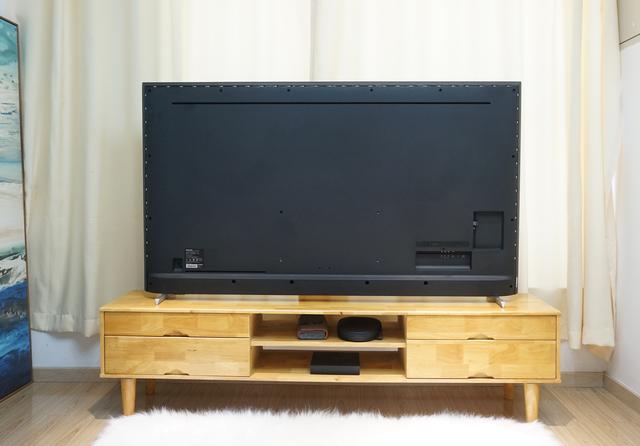 箱子拿走,放上電視,一米八的電視桌終于一展所長,70寸的電視幾乎占滿,而遠遠看去,金屬腳架與超窄金屬邊框的點綴,也讓這一眼望去全是屏幕的大電視多了些質(zhì)感。