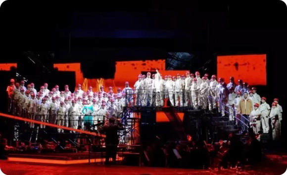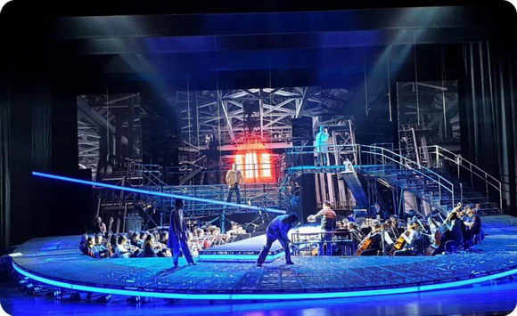 在舞美設(shè)計(jì)方面:舞臺整體呈圓形,樂隊(duì)在舞臺中間,包圍樂隊(duì)的是一個(gè)弧形,弧形前驅(qū)是一個(gè)斜坡的通道,兩邊上去后是一個(gè)高的平臺,為合唱隊(duì)提供了演出空間及高支點(diǎn),同時(shí)也是戲劇表演的空間。中區(qū)有一個(gè)貫穿平臺,是角色演員的特殊通道。視覺上非常重要,在大的結(jié)構(gòu)里再把其他的通道進(jìn)行連接,提供了非常豐富的表演空間,上下錯(cuò)落,前后穿插。