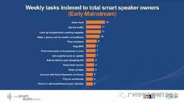 對于智能音箱的早期主流消費者而言,使用智能音箱進行操作的任務指令有以下這些(按使用頻率有高到低排列):訂餐,獲得交通資訊,查詢學習菜譜,收聽廣播電臺,查詢附近的餐廳和商場,獲得體育賽事比分,聽短篇故事,訂購東西,用手機和智能音箱連接,聽有聲讀物,給你的日程表添加日程。