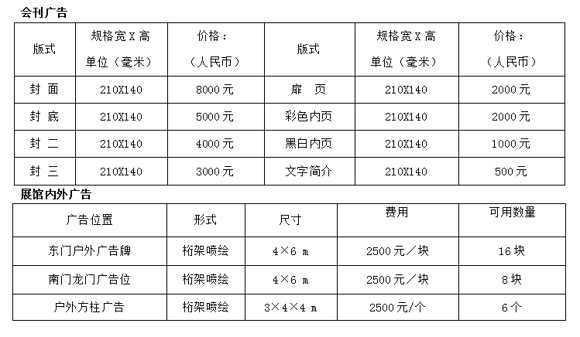 1、國際標(biāo)準(zhǔn)展臺(9 M2):國內(nèi)企業(yè)4000元/個,國外企業(yè) $800/個(角位展臺加收10%);(含中英文楣板、三面圍板、一張洽談桌、兩把椅子、兩盞射燈、一個220V/2A電源插座、客戶登記本、簽字筆等);