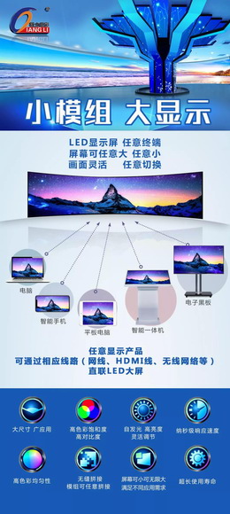 強力巨彩LED顯示屏,均由模組產(chǎn)品拼合而成,原理上只要是大于320*160mm的空間就可以開展安裝,亦可滿足屏幕上無限大的需求!只要場地允許,有多大的可用面積,就可搭建多大的LED顯示屏!