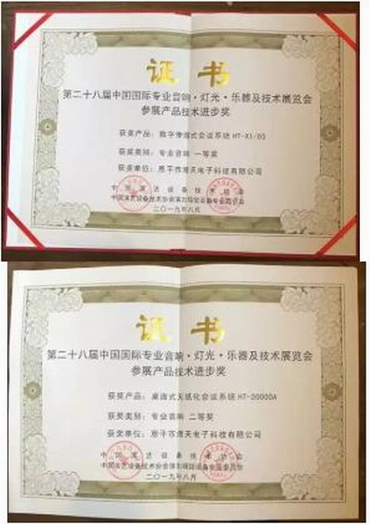 獎(jiǎng)項(xiàng)二為產(chǎn)品技術(shù)進(jìn)步獎(jiǎng),參加此項(xiàng)評(píng)選的要求較高,參賽產(chǎn)品必須具有自主知識(shí)產(chǎn)權(quán)和自我品牌,且是近兩年生產(chǎn)投放市場(chǎng)并獲得國內(nèi)外相關(guān)專利證明或權(quán)威獎(jiǎng)項(xiàng)的產(chǎn)品。海天電子一直致力于科技創(chuàng)新和新產(chǎn)品研發(fā),即使面對(duì)這樣苛刻的條件依然信心滿滿,憑借數(shù)字伸縮式會(huì)議系統(tǒng)HT-X1/03、桌面式無紙化會(huì)議系統(tǒng)HT-20000A分別榮獲產(chǎn)品技術(shù)進(jìn)步獎(jiǎng)的一等獎(jiǎng)和二等獎(jiǎng)!