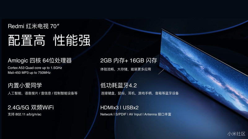 Redmi紅米電視首款產(chǎn)品采用70英寸4K超高清大屏設(shè)計(jì),其顯示面積比主流55英寸大60%以上,更大的視野優(yōu)勢(shì)帶來(lái)更震撼的沉浸感。