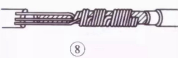 把余下的3根芯線按步驟⑤ 方法纏繞至第2圈時(shí),把前4根芯線在根部分別切斷,并鉗平;接著把3根芯線纏足3圈,然后剪去余端,鉗平切口不留毛刺