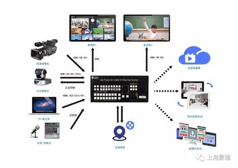通過(guò)大屏顯示設(shè)備、音頻采集系統(tǒng)、視頻采集系統(tǒng)、燈光系統(tǒng)、新媒體切換直播工作站等集成,新媒體切換直播工作站同時(shí)擁有虛擬演播、切換臺(tái)、字幕機(jī)、高清錄像、網(wǎng)絡(luò)直播五合一系統(tǒng)功能。