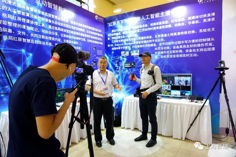上海景瑞攜眾多產(chǎn)品亮相本次展會(huì), “紅屏天下”互動(dòng)智慧教室、“紅屏天下”新媒體人工智能主播中心、可穿戴式錄直播系統(tǒng)。