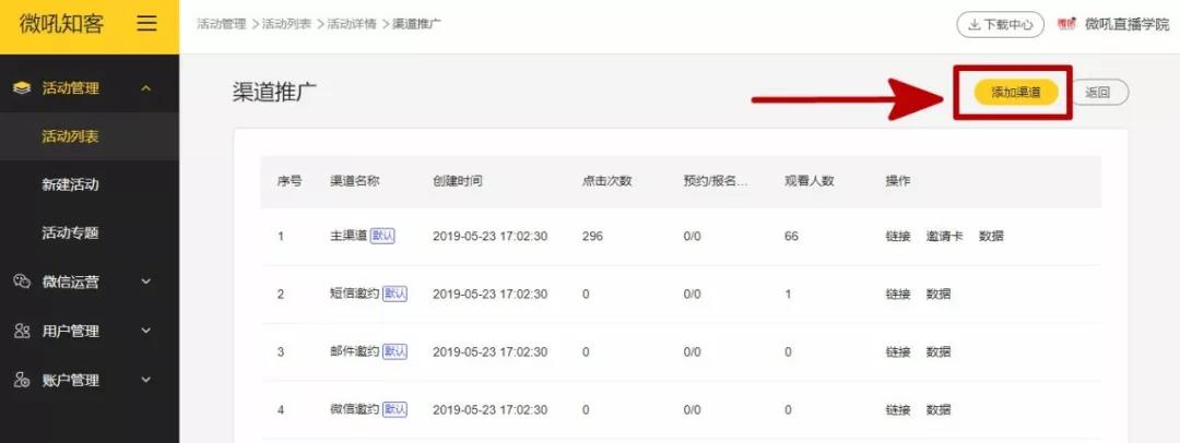 微吼知客自上線以來,一直致力于融合大數(shù)據(jù)+AI,為企業(yè)抬升營銷增長空間。2020年開年,微吼知客即上線新版本。新版本在拉新獲客、盤活用戶、整合數(shù)據(jù)方面繼續(xù)下功夫,新增了渠道管理功能,并深度切入微信生態(tài),進行更深度的數(shù)據(jù)融合。市場環(huán)境,對企業(yè)提出精細化運營的要求,微吼知客也精益求精,從趨勢與落地上,全面支持企業(yè)客戶需求。