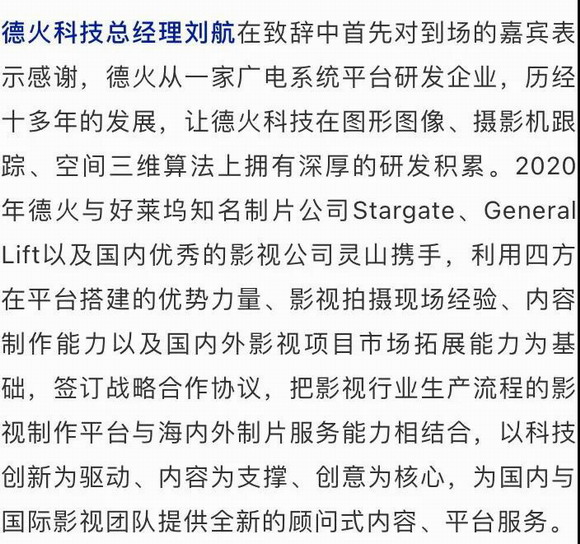 2020年12月18日,“虛實交互 影因無界”2020 LED影視拍攝系統(tǒng)平臺發(fā)布會暨合作戰(zhàn)略簽訂儀式在北京新華網(wǎng)媒體創(chuàng)意工場成功舉辦;顒佑傻禄鹂萍贾鬓k,靈山科技、美國Stargate(星門)、美國General Lift(將軍在上)共同協(xié)辦,新華網(wǎng)為合作單位。數(shù)字化影視成為新影視產(chǎn)業(yè)發(fā)展趨勢的當(dāng)下,大量影視拍攝開始引進虛擬技術(shù)進行制作,本次將重點圍繞徳火自主研發(fā)的DRS-LED影視拍攝系統(tǒng)展開。