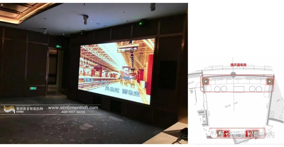 線陣列系統(tǒng)圍繞LED電子屏按上下左右布局,共計(jì)4只,同時(shí)搭配一只卡拉OK的重低音揚(yáng)聲器。揚(yáng)聲器外觀與室內(nèi)美學(xué)設(shè)計(jì)相結(jié)合,全部于裝飾面后方,做隱藏設(shè)計(jì)。