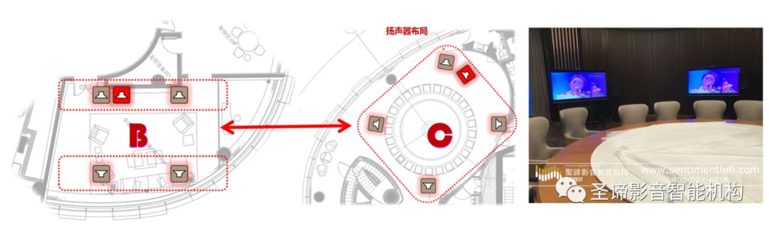 簡(jiǎn)而言之,B區(qū)的會(huì)客廳和C區(qū)的聚餐K歌用音箱設(shè)備,工程技術(shù)師對(duì)兩個(gè)區(qū)域的卡拉OK揚(yáng)聲器系統(tǒng)編程設(shè)置好后,只需將音箱設(shè)備與預(yù)留的墻面接口面板連接,即可保證在兩個(gè)區(qū)域內(nèi)的互用。