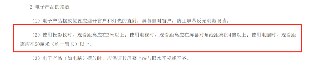國(guó)家衛(wèi)生健康委發(fā)布的《指引》顯示“使用投影儀時(shí),觀看距離應(yīng)在3米以上;使用電視時(shí),觀看距離應(yīng)在屏幕對(duì)角線距離的4倍以上;使用電腦時(shí),觀看距離應(yīng)在50厘米(約一臂長(zhǎng))以上。”