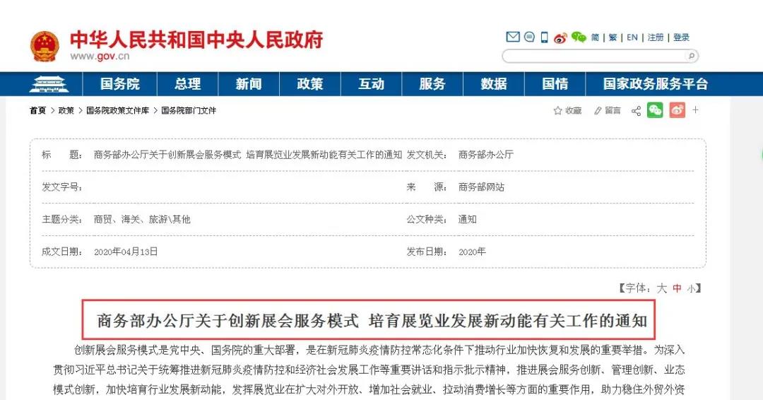 創(chuàng)新展會服務(wù)模式是黨中央、國務(wù)院的重大部署,是在新冠肺炎疫情防控常態(tài)化條件下推動行業(yè)加快恢復(fù)和發(fā)展的重要舉措。為推進(jìn)展會服務(wù)創(chuàng)新、管理創(chuàng)新、業(yè)態(tài)模式創(chuàng)新,加快培育行業(yè)發(fā)展新動能,發(fā)揮展覽業(yè)在促進(jìn)經(jīng)貿(mào)合作、增加社會就業(yè)、拉動消費(fèi)增長等方面的重要作用,2020年4月13日,商務(wù)部發(fā)布了《關(guān)于創(chuàng)新展會服務(wù)模式 培育展覽業(yè)發(fā)展新動能有關(guān)工作的通知》(以下簡稱《通知》);