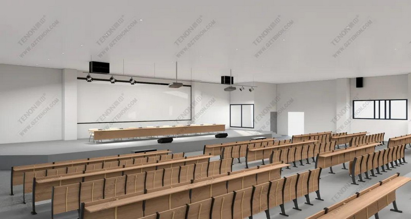 本次騰中為云南某學校多功能會議廳設計方案時,由于具備舞臺功能的多功能會議場所牽涉的關(guān)聯(lián)子系統(tǒng)眾多,各個子系統(tǒng)既要能獨立工作,也要與其它子系統(tǒng)聯(lián)動,而且還要做到集中控制管理。因此要求各個子系統(tǒng)之間的通信協(xié)議必需非常匹配,設計要求難度非常的大。從整個會場考慮,除涉及到傳統(tǒng)多功能會議室所必備的大屏幕顯示系統(tǒng)、投影系統(tǒng)、手拉手會議系統(tǒng)、無線會議系統(tǒng)、高清信號切換系統(tǒng)、擴聲系統(tǒng)、中央控制系統(tǒng)外,為了舞臺特效而加入舞臺燈光系統(tǒng)。