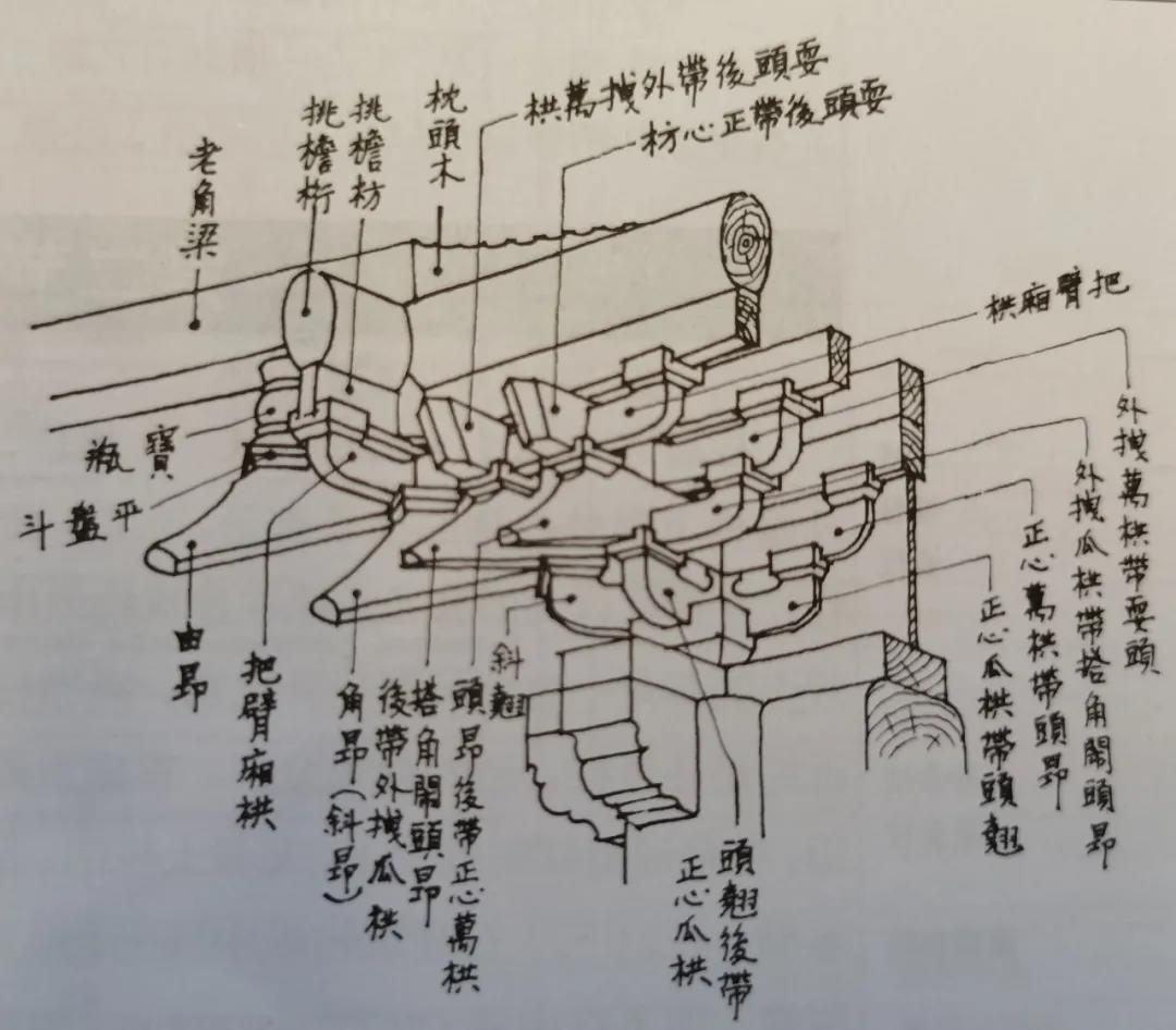 其中,屋頂?shù)奶厥廨喞侵袊ㄖ庑紊献铒@著的特征,屋檐支出深遠則又為其特點之一,為求這檐部的支出,用多層曲木承托,便在構(gòu)架中產(chǎn)生了一個重要的斗拱部分。