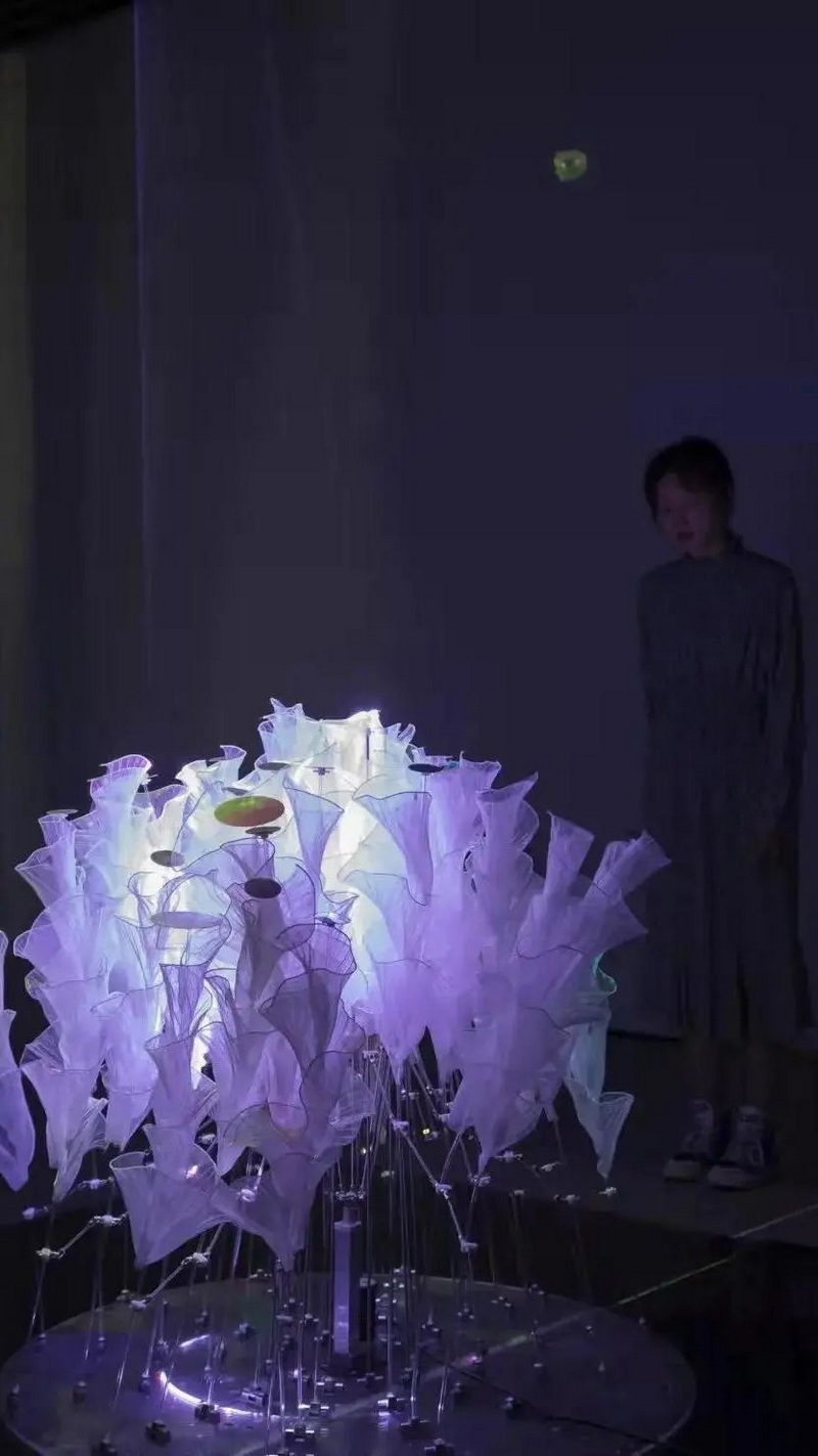機(jī)械花在觀眾靠近時(shí)便收起綻放的花瓣,被激光掃描而出的虛空間包裹在內(nèi),當(dāng)觀眾離開時(shí)悄然綻放從人面對(duì)他人時(shí)自我情緒隱藏的現(xiàn)象出發(fā),內(nèi)在世界無法完全獨(dú)立于外部世界存在,內(nèi)部世界與外部世界時(shí)刻處在一種動(dòng)態(tài)的“交互與平衡”之中。