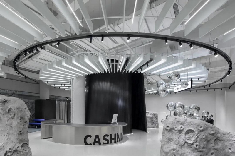 我們把這處空間想象成一個來自遙遠星際的外來物種,空降在成都這片土地上,互相激發(fā)出超越現(xiàn)實的宇宙能量。星軌、月球表面的隕石坑和火星,成為這一遙遠想象的影像載體。我們利用新媒體等手段,依托空間與視覺關系,在600平方米的跨層空間中完成了這次的物理轉(zhuǎn)換,構(gòu)建來自遙遠星際的“能量場”,以一種帶有亙古意味的永恒姿態(tài),消解了在這潮流快速迭代的年代里充斥的動蕩感。
