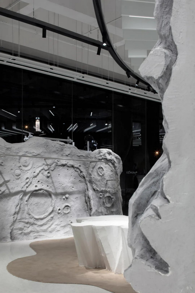 新零售空間當下所截取的“時髦表皮”,往往被自身不斷更迭的產(chǎn)品所傳達出的藝術信息給顛覆。所以,我們選取月球表面和火星影像作為整個空間的基底皮膚,以此抵抗這一悖論所形成的局面。
