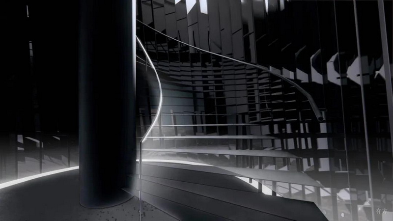 視覺團隊又在樓梯頂部放置了屏幕,在其中注入主題化的視覺內(nèi)容。屏幕被點亮的時刻,畫面被無限反射和旋轉(zhuǎn),置身其中的時間旅行者會體驗到一種短暫的扭曲時空感,預示著星際旅程的開始。