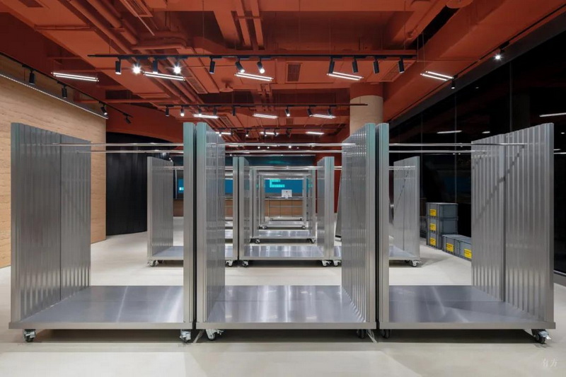 半封閉表皮將屏幕包裹在內(nèi),承接起上下場景的切換作用。圓環(huán)形的紅土色造型,實際上又內(nèi)藏了整套防火卷簾設備。更衣室是五組白色膠囊容器裝置,上部屏幕和其他裝置畫面同步聯(lián)動。店內(nèi)的金屬道具靈活多變,可以隨意組合。收銀臺也是一組裝置,背景上的一條長屏可以輸出不同主題的信息和氛圍,成為“另一個時空”的窗口。