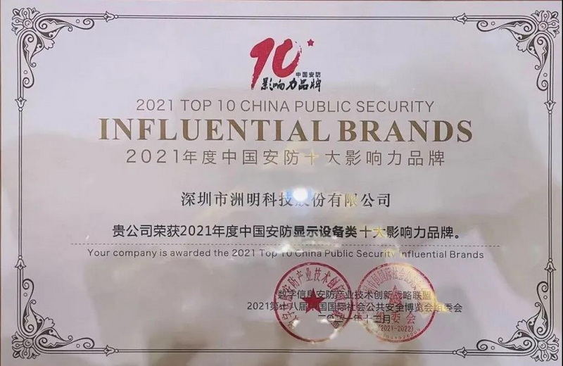 ▲洲明榮獲“2021年度中國安防十大影響力品牌