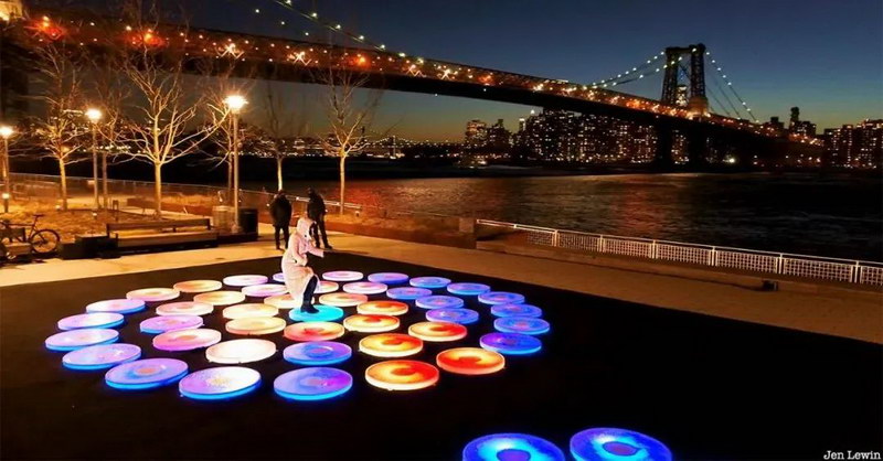 由美國新媒體藝術(shù)家Jen Lewin創(chuàng)作的Reflect是一種沉浸式的、多感官的體驗,其靈感來自于自然界中發(fā)現(xiàn)的有機系統(tǒng)所創(chuàng)造的動態(tài)模式。這座雕塑占地2400平方英尺,由三個同心圓組成,每個同心圓由互動平臺組成,響應(yīng)游客的腳步,觸發(fā)光的飛濺,創(chuàng)造出不斷變化的構(gòu)圖。這個裝置將鼓勵紐約人停下來思考和發(fā)現(xiàn),并在城市進入一個充滿希望和復(fù)興的新時代時激發(fā)聯(lián)系。