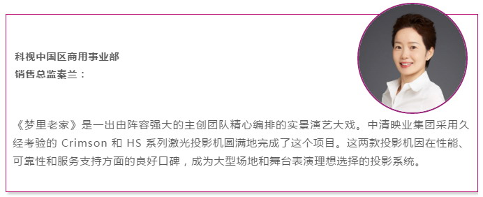 “我們很榮幸參與《夢里老家》大型山水實景演出的投影環(huán)節(jié)。為配合此次升級,我們配置了 6 臺科視激光投影機,將原本出色的投影效果推向更高水準(zhǔn)。考慮到投影距離、環(huán)境光和其他環(huán)境因素,我們認(rèn)為 Crimson WU31 和 DWU2022-HS 激光投影機較適合在 40 米寬、13 米高的巨幕舞臺上投影畫面。因客戶高度認(rèn)可科視投影機,在此次升級中依然選擇科視!