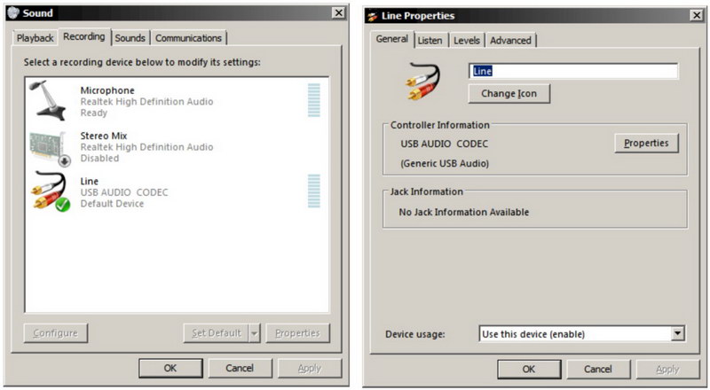 從Windows的“開始”按鈕中選擇“控制面板/聲音”。聲音控制面板打開后,選擇“錄音”選項卡,如下所示(左)。接下來,雙擊線路設(shè)備“ USB AUDIO CODEC”以打開如下所示的“屬性”窗口(右)。