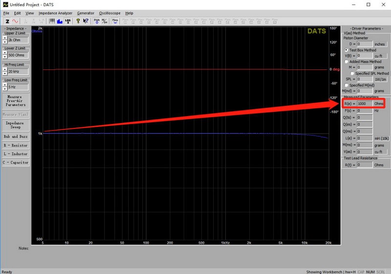 將測試導(dǎo)線連接到DATS V3前面板上的金屬校準(zhǔn)端子上。在“Impedance Calibration…”菜單下選擇“Impedance Analyzer”,并按照說明使用內(nèi)置的±0.1%校準(zhǔn)電阻以1k歐姆校準(zhǔn)系統(tǒng)。軟件將測試參考電阻并繪制結(jié)果。確認(rèn)屏幕右側(cè)的RE字段顯示的值非常接近1000歐姆。如果不是,重復(fù)校準(zhǔn)程序。數(shù)值通常在995到1005歐姆之間。