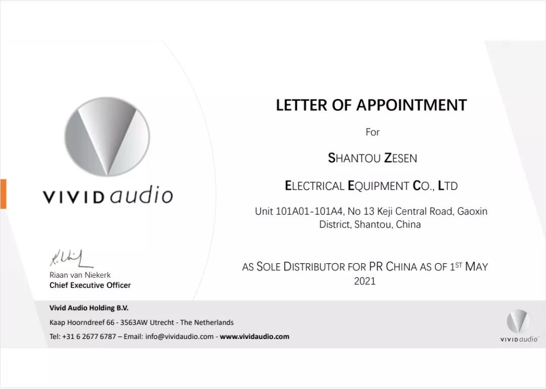 VIVID audio 與澤森音響簽定合作協(xié)議,即日起,由澤森音響負責VIVID audio 產品在中國的總代理業(yè)務,澤森音響將竭誠為廣大發(fā)燒友帶來VIVID audio 優(yōu)質產品,并提供相關的售后服務。特此聲明。