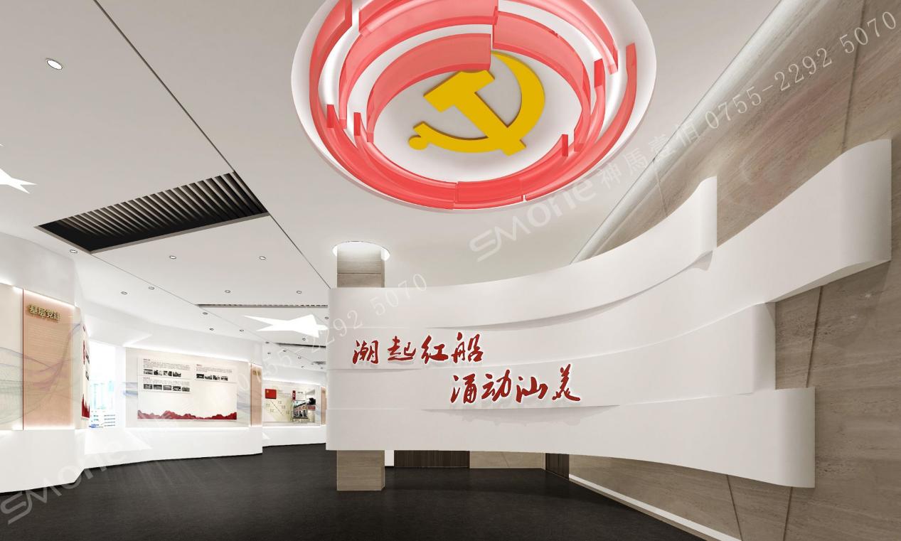 海陸豐革命史及汕尾黨建工作展示區(qū),形象墻及黨徽整體以海浪形式為造型,切合主題——潮起紅船 涌動(dòng)汕美;