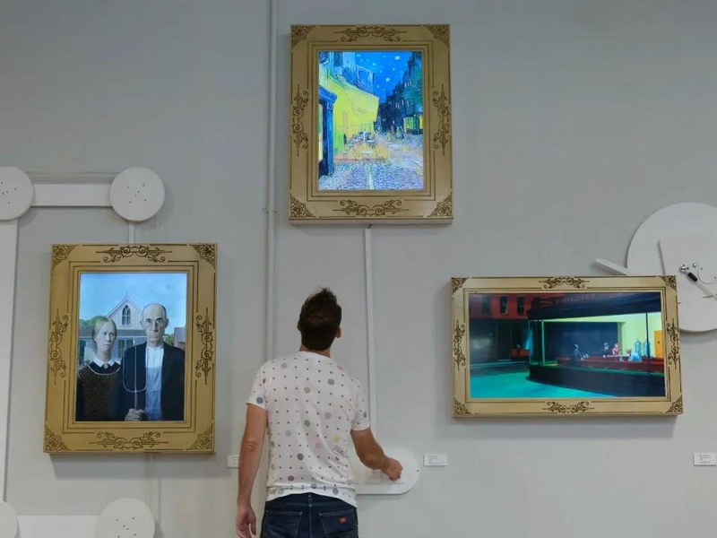 參與者通過拉動(dòng)繩索裝置,將原畫作的場景變成了夜晚的樣子,同時(shí),也為畫作里嚴(yán)肅的兩位農(nóng)民更換著裝,頓時(shí)化身成為了艷麗的“時(shí)尚達(dá)人”。