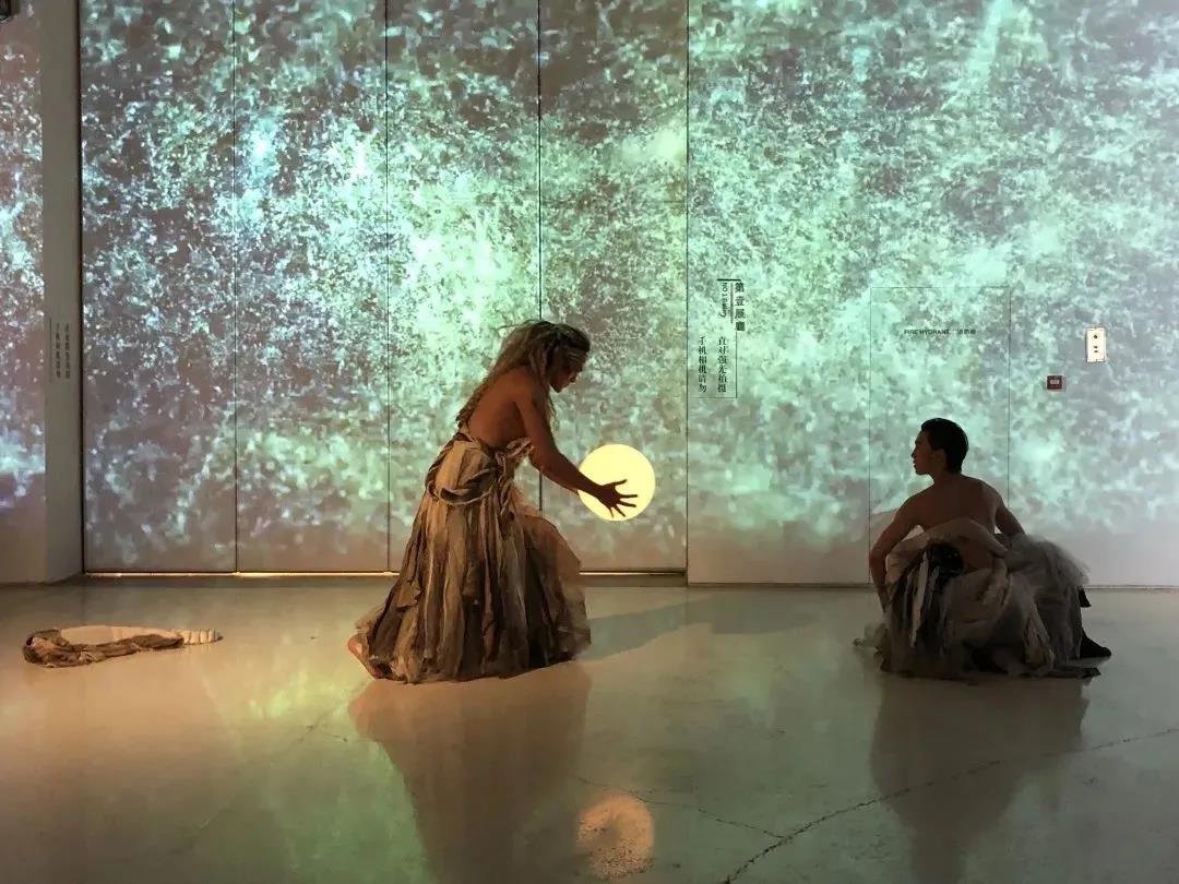 演出過程中設(shè)置了大量的引導(dǎo)性互動,通過高度儀式化的藝術(shù)性肢體動作,精心設(shè)計(jì)的環(huán)節(jié),象征寫意化的數(shù)字視覺背景,突破現(xiàn)實(shí)時空的局限和慣性思維的束縛,打破具象化的窠臼。