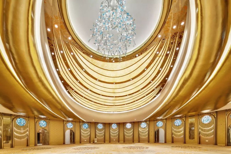 酒店宴會(huì)廳大堂的設(shè)計(jì)追求整體統(tǒng)一,以弧形線條來(lái)構(gòu)造這個(gè)空間,設(shè)計(jì)師別出心裁的使用現(xiàn)代簡(jiǎn)潔的設(shè)計(jì)手法來(lái)體現(xiàn)豪華的空間感受。而圓形宴會(huì)廳的平面則呈現(xiàn)一個(gè)橢圓形,寓意圓滿。整個(gè)宴會(huì)廳面積1700平米,能容納1200人的豪華宴會(huì),墻面采用陣列的設(shè)計(jì)手法,使整體空間和諧統(tǒng)一,旇倪\(yùn)用彰顯了墻面空間的豪華感,天花設(shè)計(jì)的靈感源于欲振翅高飛的蝴蝶,整體表現(xiàn)效果美輪美奐。