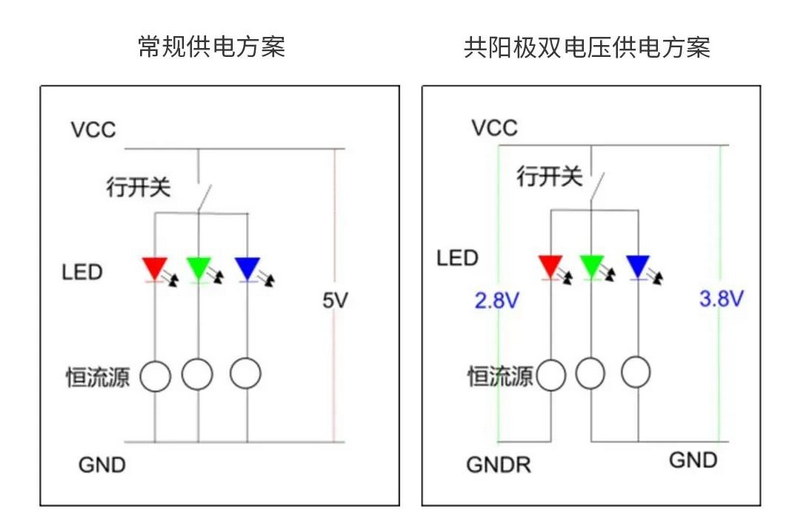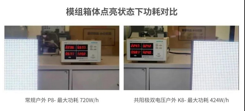 與常規(guī)產(chǎn)品對(duì)比顯示:共陽(yáng)極雙電壓供電節(jié)能產(chǎn)品,整屏功耗較常規(guī)產(chǎn)品明顯下降。