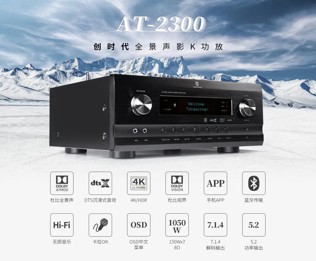 AT- 2300與市面上全景聲功放最大的不同,在于它具有極其充足的儲(chǔ)備功率,以及增加了5.1.2專業(yè)數(shù)字卡拉OK功能,通過遙控器可實(shí)現(xiàn)一鍵“影K切換”,這在各大音響品牌的高端產(chǎn)品上也是絕無僅有的存在。