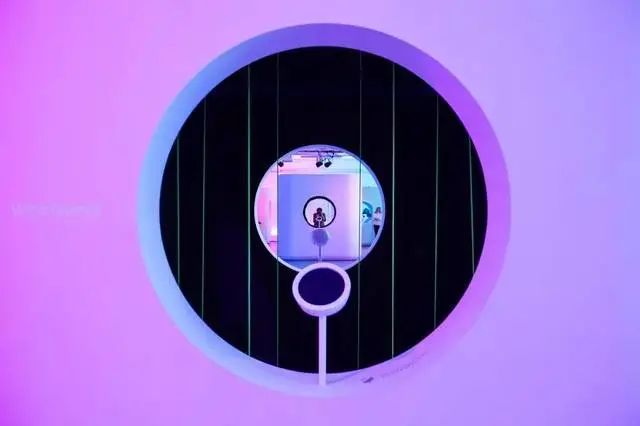 大圓鏡面將體驗(yàn)者的彩色光影反射到墻面上。當(dāng)體驗(yàn)者將自己置于光錐中時(shí),便會(huì)在墻面上找到共鳴的引語(yǔ)。