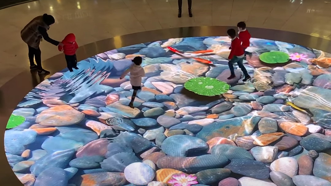 地面互動的效果有很多,比如投影的是水面,人踩上去有水紋波、水里有魚,人踩上去的時候魚兒會游開、又比如人踩的地方花會綻放等。