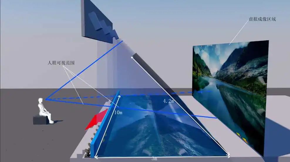 由于人眼觀測到的成像位置在反射膜內(nèi)側(cè),且反射膜具有相當(dāng)高的透明度,配合上恰當(dāng)?shù)陌祱鲭[藏,最終會給觀眾呈現(xiàn)出漂浮的立體影像。